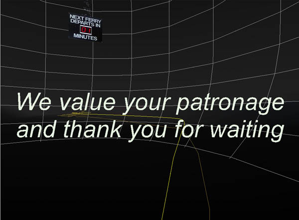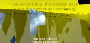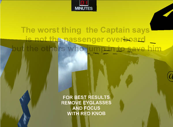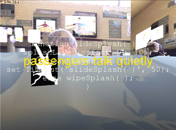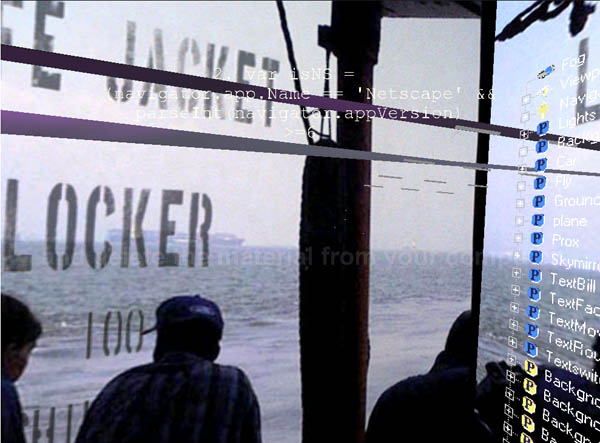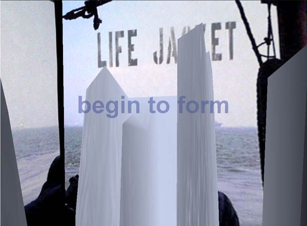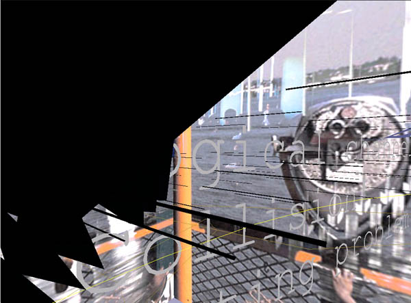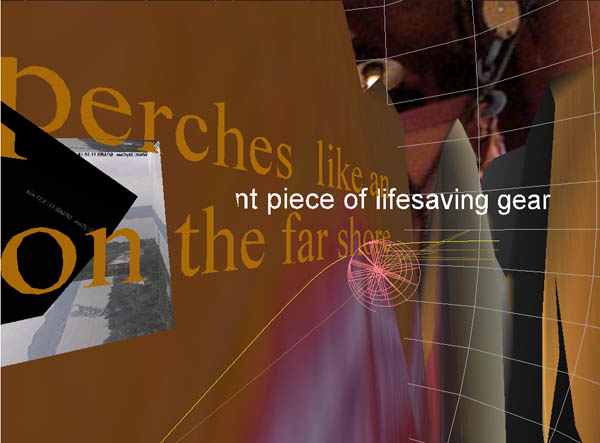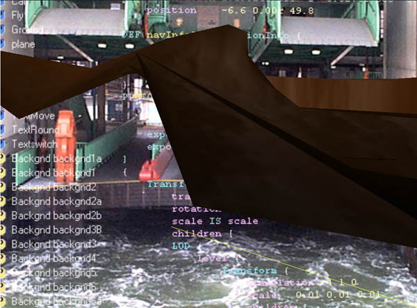 Recent performances were designed for presentation as spectacles in physical locations. Making use of the output of 3 vrml cameras, ADRIFT was received by three computers and projected by three projectors onto a semicircular screen. The work focused on multiple journeys through a harbor and through virtual space.